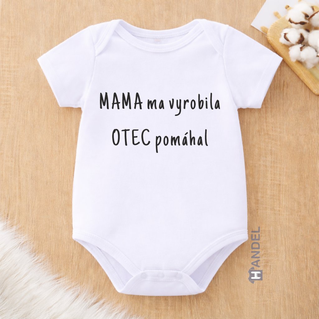Roztomilé detské body s vtipným nápisom „Mama ma vyrobila, otec pomáhal“, ktoré poteší rodičov aj okolie a je ideálne ako milý darček pre bábätko.