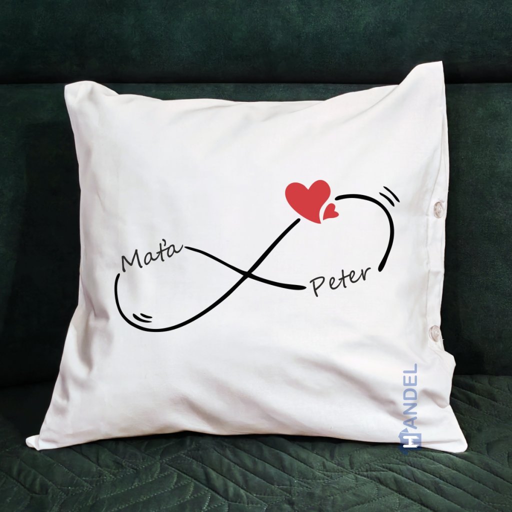 Jemný a elegantný vankúš s motívom nekonečna a srdca, ktorý symbolizuje lásku bez konca. Mená na vankúši je možné ľubovoľne upraviť, vďaka čomu vznikne jedinečný a osobný darček. Ideálny ako dar pre partnera, na výročie, Valentína alebo len tak z lásky.